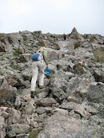 I hurried down the mountain and luckily picked a path that took me right past Emily. She called and I saw her crouching beneath the overhang of a big boulder (not a safe place). Her eyes were as big as saucers- she was pretty cute, actually. Together, we continued toward the tree line, keeping our distance from each other (because you hope only one gets hit by lightning at a time). We later recounted the strange realization that, as we said, "I could die now... or... now!" By the time we made it to the tree line the rain was letting up. When we got to camp we took off our wet clothes, laid down in the tent, and waited for James.
