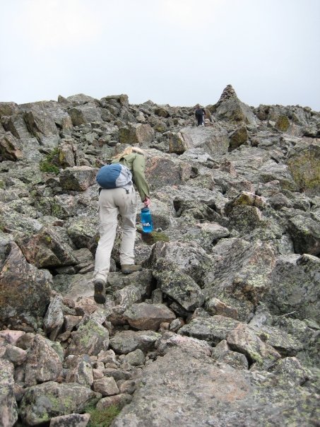 The sky was overcast as we started hiking and the temperature was pleasantly cool. Each year a few people get lost coming off Holy Cross because they follow the wrong path down, so I told James and Emily that if someone gets separated and loses the trail they should turn right, find the creek, and follow that back to camp. We hiked up some broad switchbacks and quickly got above the tree-line. Holy Cross is a big, open, granite peak. There are multiple paths to the top and the hike involves walking over large boulders. At a certain point, Emily told James and I to keep going and she would travel at her own speed. If she didn’t make it to the top we would catch her on our way down.